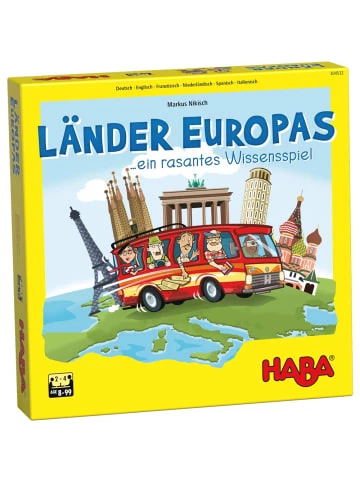 Das Spiel Laender Europas von HABA ist ein spannendes Wissensspiel ab 8 Jahren– zum spielerischen Kennenlernen der 51 Laender Europas– Spielspass fuer die ganze Familie– mit einer schwierigen Spielvariante fuer echte Europa-KennerAuf gehts durch die 51 Laender Europas! Bei dem lustigen Denkspiel Laender Europas von HABA helfen die Spieler den verirrten Touristen, herauszufinden, in welchem Land sie sich gerade befinden. Wer als Erster anhand der Hinweiskarten das gesuchte Land erraet, kann Punkte sammeln und weitergehen. Wer es trotz der Hilfestellungen nicht weiss, muss stehenbleiben. Und wer sich in Europa am besten auskennt und den Spielplan mit seinem Touristen aus Holz als Erster umrunden kann, hat das Spiel gewonnen. Toller Spielspass ab 8 Jahren fuer die ganze Familie mit einer schwierigen Variante fuer echte Europa-Experten.Inhalt: 4 Touristen-Spielfiguren, 1 Spielplan, 4 Flaggen-Uebersichtstafeln, 76 Spielkarten (51 Laenderkarten, 16 Antwortkarten, 8 Risikokarten, 1 Gucken-verboten!-Karte), 1 Spielanleitung.Spieldauer: ca. 20 MinutenAchtung: Nicht für Kinder unter 3 Jahre geeignet. Erstickungsgefahr durch verschluckbare Kleinteile.