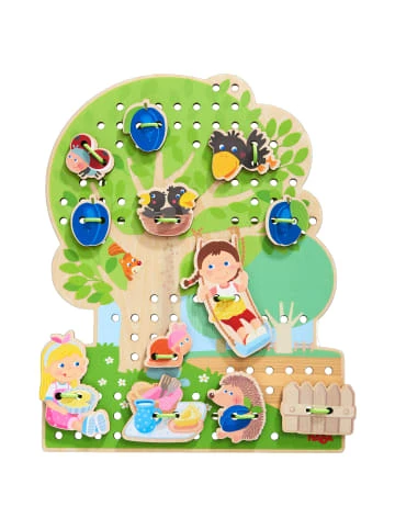 Fädelspiel Obstgarten enthält 31 Fädelplättchen, 2 Fädelschnüre und 2 doppelseitig bedruckte Vorlagenkarten 34×25,5 cm. Ab 3 Jahren.